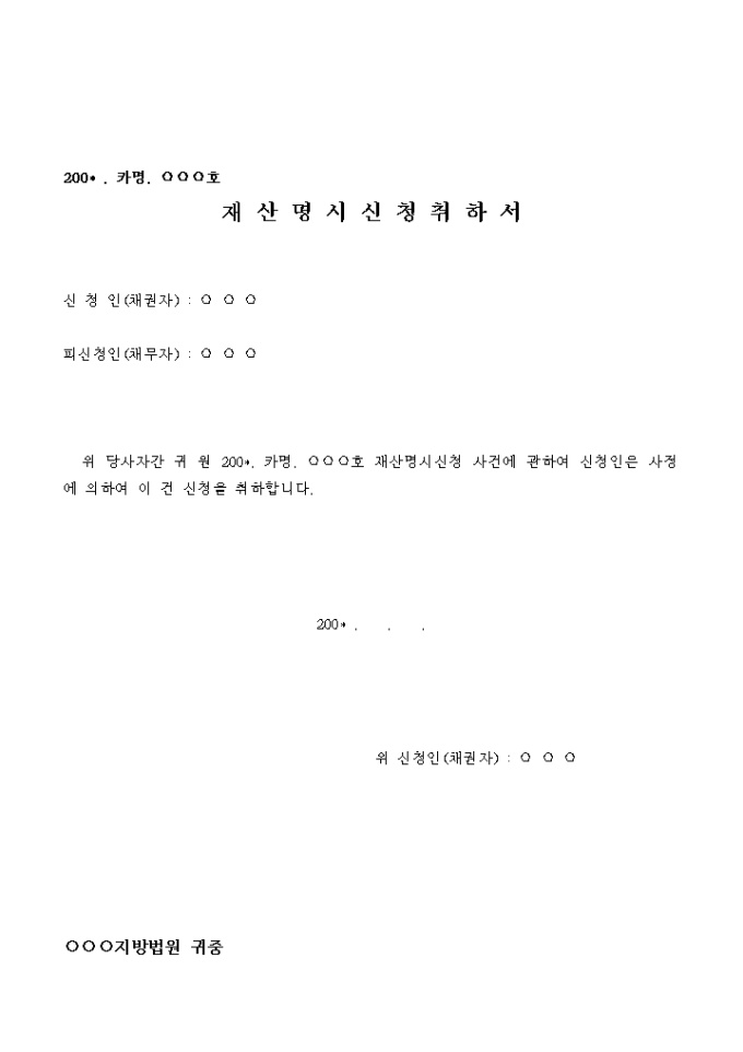 9,000원/월위 당사자간 귀 원 200*. 카명. ○○○호 재산명시신청 사건에 관하여 신청인은 사정에 의하여 이 건 신청을 취하합니다.