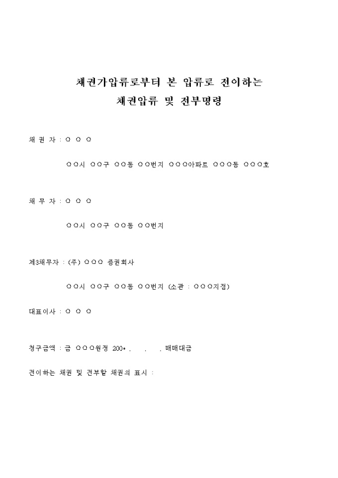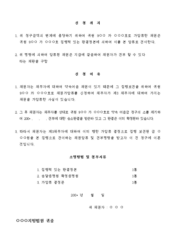 9,000원/월위 청구금액의 변제에 충당하기 위하여 귀원 9○○ 카 ○○○호로 가압류한 채권은 귀원 9○○ 가 ○○○호 집행력 있는 판결정본에 의하여 이를 본 압류로 전이한다.