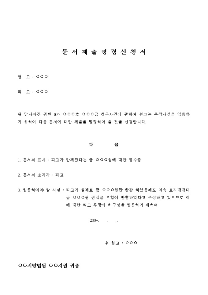 9,000원/월위 당사자간 귀원 9가 ○○○호 ○○○금 청구사건에 관하여 원고는 주장사실을 입증하기 위하여 다음 문서에 대한 제출을 명령하여 줄 것을 신청합니다.
