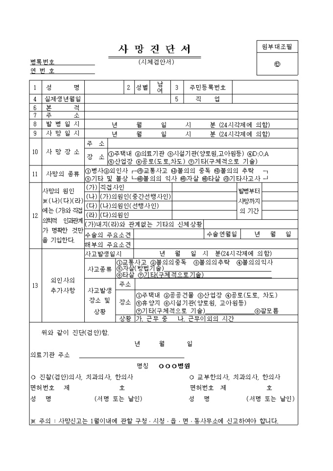 9,000원/월사망원인이 된 발명이나, 사고종류를 기재한 사망진단(시체검안)서입니다.
