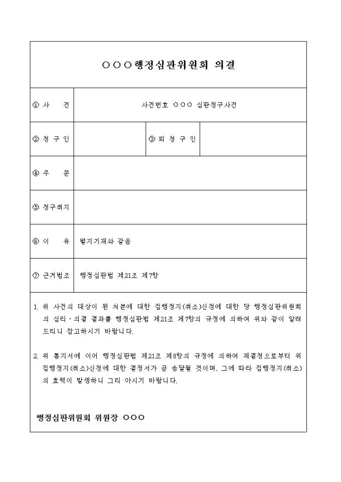 9,000원/월위 사건의 대상이 된 처분에 대한 집행정지(취소)신청에 대한 당 행정심판위원회의 심리?의결 결과를 행정심판법 제21조 제7항의 규정에 의하여 위와 같이 알려드리니 참고하시기 바랍니다.