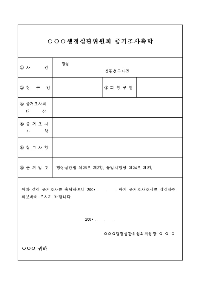 9,000원/월행정심판법 제28조 제2항, 동법시행령 제24조 제5항 위와 같이 증거조사를 촉탁하오니 200* . . . 까지 증거조사조서를 작성하여 회보하여 주시기 바랍니다.
