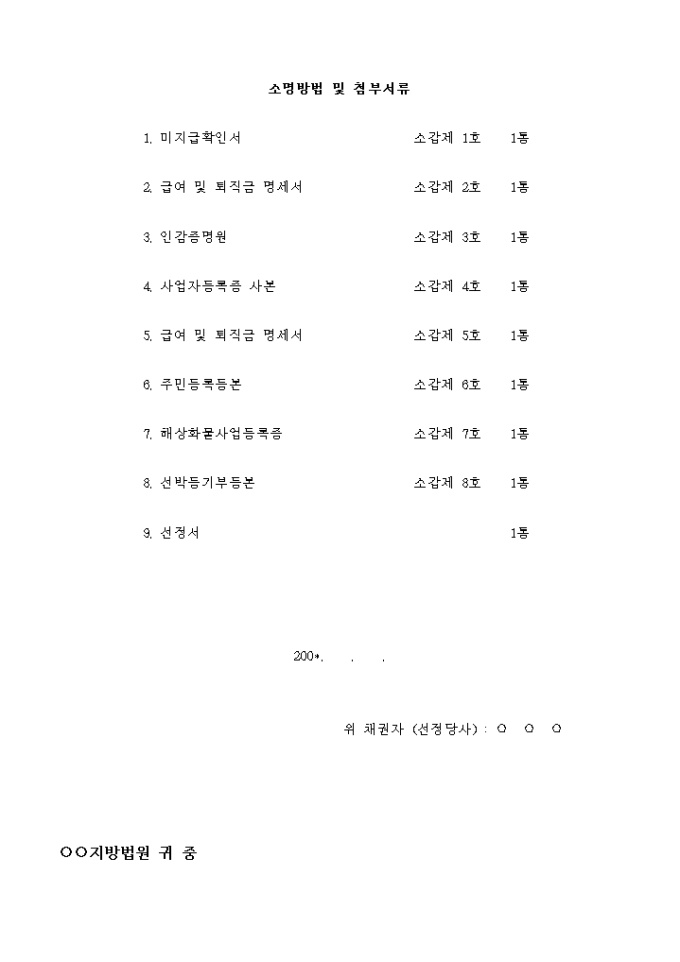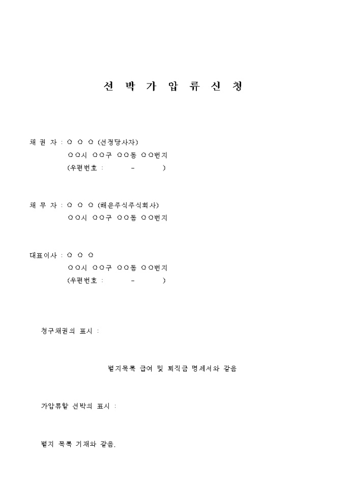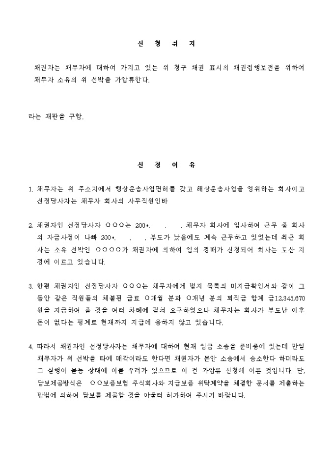 9,000원/월채권자는 채무자에 대하여 가지고 있는 위 청구 채권 표시의 채권집행보전을 위하여 채무자 소유의 위 선박을 가압류한다.