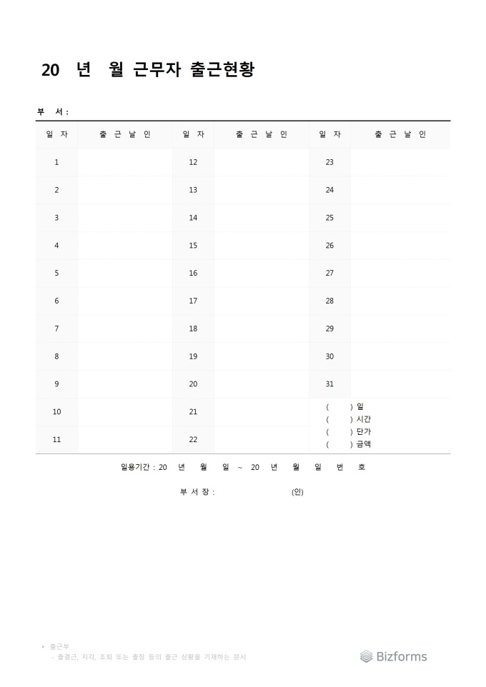 9,000원/월일자, 출근날인 등의 항목으로 구성되어있는 근로자 출근부대장 양식입니다.