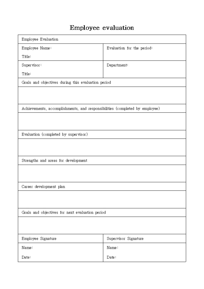 9,000원/월Employee Name, Evaluation for the period, Supervisor, Department 등의 항목으로 구성되어있는 영문 직원평가서(Employee evaluation) 양식입니다.