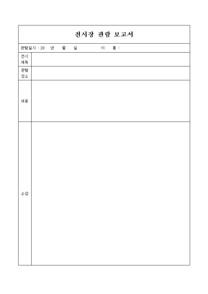 9,000원/월전시제목, 관람장소, 내용, 소감 등의 항목으로 구성되어있는 전시장 관람 보고서 양식입니다.