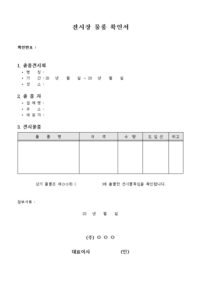 9,000원/월확인번호, 출품 전시회, 출품자, 전시물품 등의 항목으로 구성되어있는 전시장 물품 확인서 양식입니다.