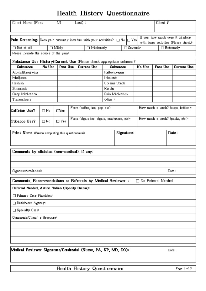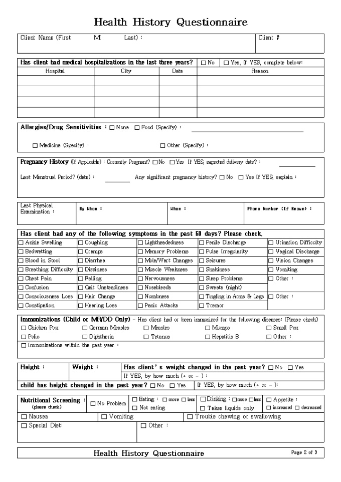9,000원/월영문으로 작성되어있는 건강력 설문지 양식입니다.