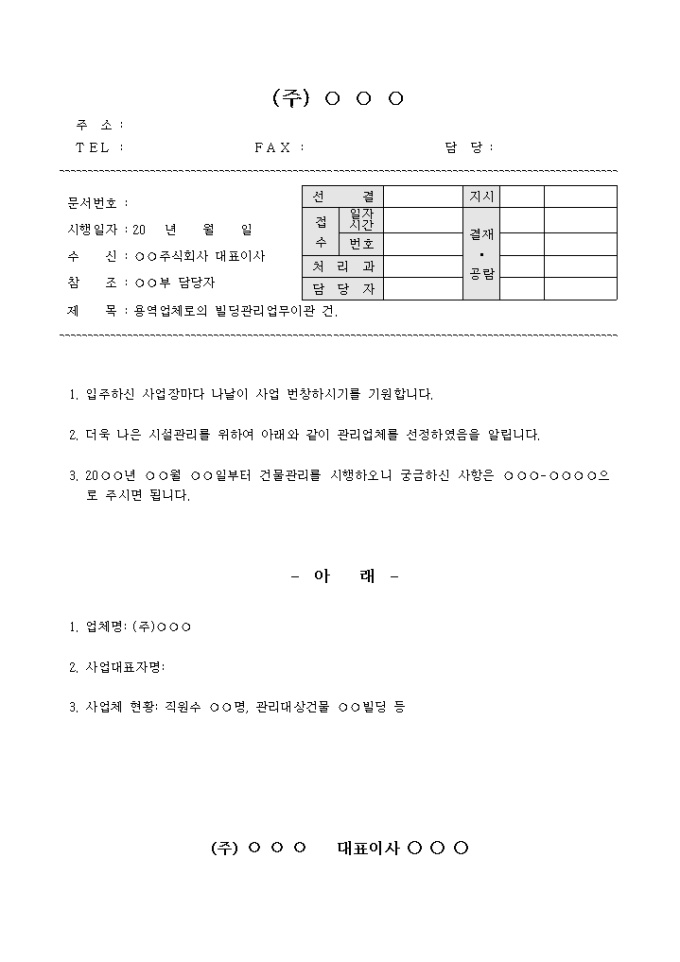 9,000원/월더욱 나은 시설관리를 위하여 아래와 같이 관리업체를 선정하였음을 알리는 공문예제(용역업체로의 빌딩관리업무이관 건)입니다