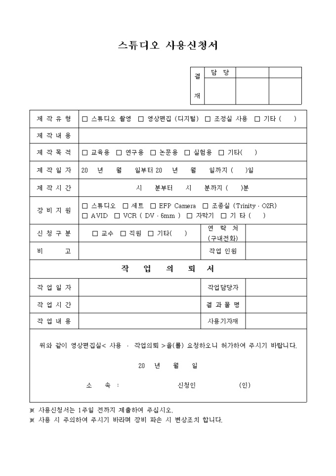9,000원/월제작유형, 제작내용, 제작목적, 제작기간 등의 항목으로 구성되어있는 스튜디오 사용신청서 양식입니다.