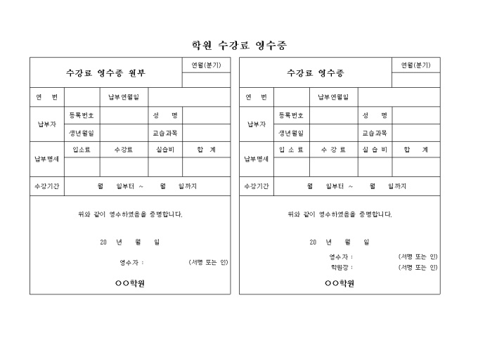 9,000원/월연번, 납부연월일, 납부자, 납부명세, 수강기간 등의 항목으로 구성된 학원 수강료 영수증 양식입니다. 영수증 원부를 포함하고 있습니다.