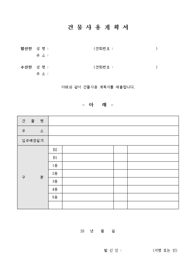 9,000원/월건물명, 주소, 입주예정일자, 구분 등의 항목으로 구성된 건물사용 계획서 양식입니다.