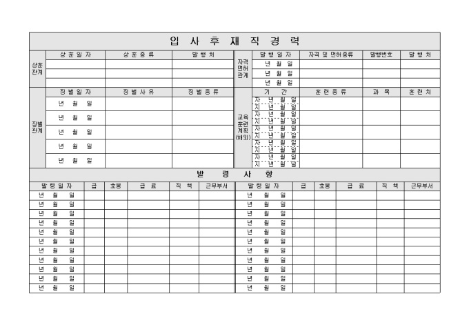 9,000원/월입사 시 제출서류로서 입사자의 인사에 관한 사항을 기록/ 관리할 때 사용하는 인사기록부 양식입니다. 성명, 학력, 가족관계, 상훈관계, 징벌관계 등의 항목으로 구성되어있습니다.