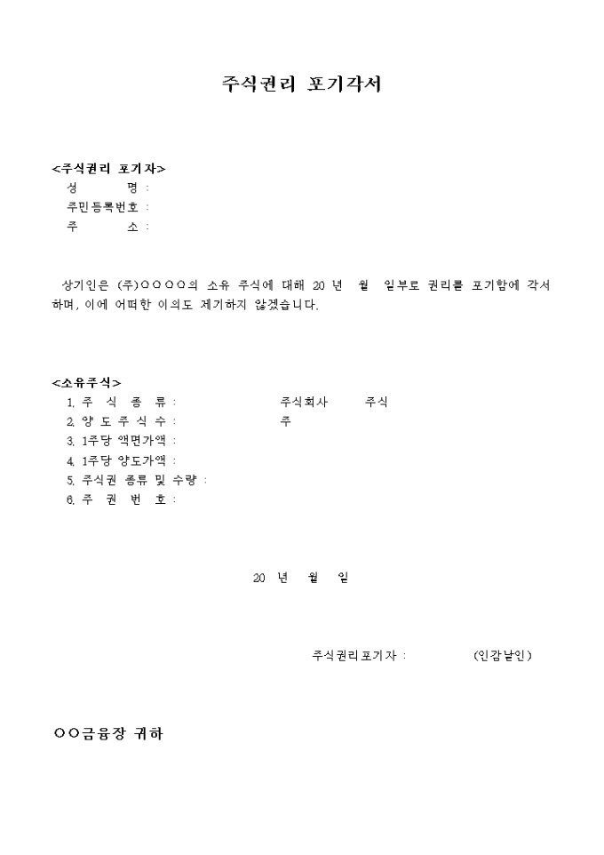 9,000원/월상기인은 (주)○○○의 소유 주식에 대해 권리를 포기함과 동시에 이에 어떠한 이의도 제기하지 않는다는 내용의 각서입니다