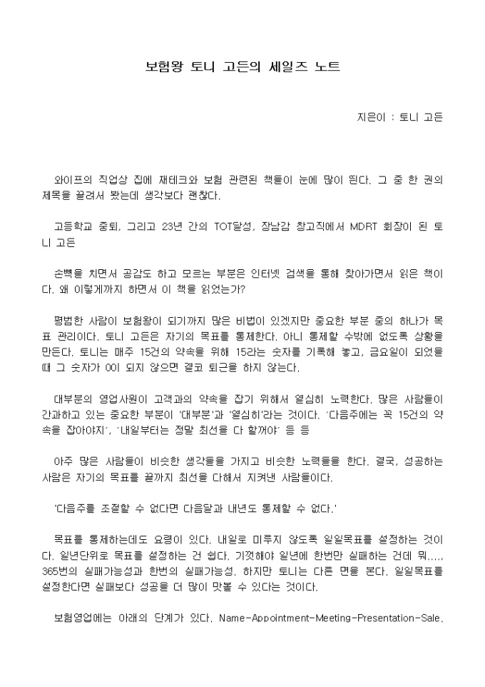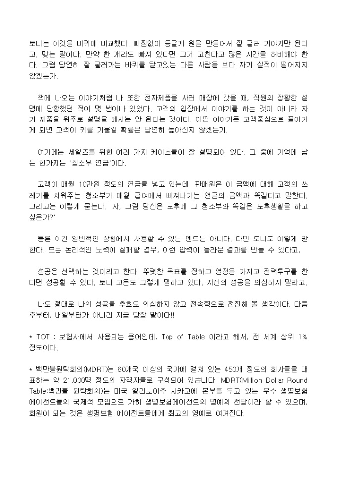 9,000원/월[본문 미리보기] 와이프의 직업상 집에 재테크와 보험 관련된 책들이 눈에 많이 띈다. 그 중 한 권의 제목을 끌려서 봤는데 생각보다 괜찮다. 고등학교 중퇴, 그리고 23년 간의 TOT달성, 장남감 창고직에서 MDRT 회장이 된 토니 고든 손뼉을 치면서 공감도 하고 모르는 부분은 인터넷 검색을 통해 찾아가면서 읽은 책이다. 왜 이렇게까지 하면서 이 책을 읽었는가? 평범한 사람이 보험왕이 되기까지 많은 비법이 있겠지만 중요한 부분 중의 하나가 목표 관리이다. 토니 고든은 자기의 목표를 통제한다. 아니 통제할 수밖에 없도록 상황을 만든다. 토니는 매주 15건의 약속을 위해 15라는 숫자를 기록해 놓고, 금요일이 되었을 때 그 숫자가 0이 되지 않으면 결코 퇴근을 하지 않는다.