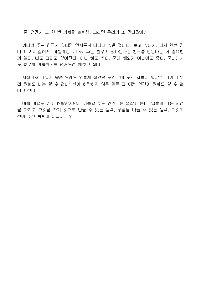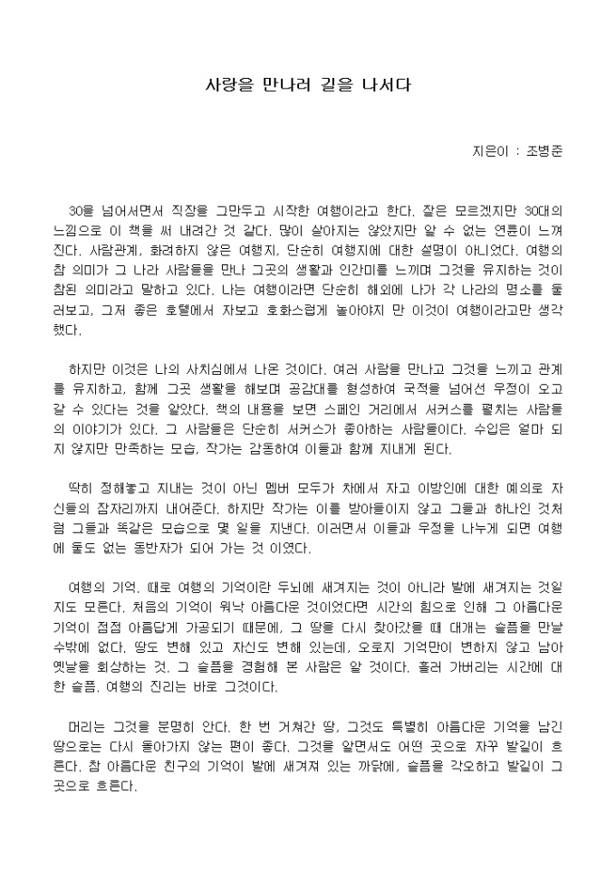 9,000원/월[본문 미리보기] 30을 넘어서면서 직장을 그만두고 시작한 여행이라고 한다. 잘은 모르겠지만 30대의 느낌으로 이 책을 써 내려간 것 같다. 많이 살아지는 않았지만 알 수 없는 연륜이 느껴진다. 사람관계, 화려하지 않은 여행지, 단순히 여행지에 대한 설명이 아니었다. 여행의 참 의미가 그 나라 사람들을 만나 그곳의 생활과 인간미를 느끼며 그것을 유지하는 것이 참된 의미라고 말하고 있다. 나는 여행이라면 단순히 해외에 나가 각 나라의 명소를 둘러보고, 그저 좋은 호텔에서 자보고 호화스럽게 놀아야지 만 이것이 여행이라고만 생각했다. 하지만 이것은 나의 사치심에서 나온 것이다. 여러 사람을 만나고 그것을 느끼고 관계를 유지하고, 함께 그곳 생활을 해보며 공감대를 형성하여 국적을 넘어선 우정이 오고 갈 수 있다는 것을 알았다. 책의 내용을 보면 스페인 거리에서 서커스를 펼치는 사람들의 이야기가 있다. 그 사람들은 단순히 서커스가 좋아하는 사람들이다. 수입은 얼마 되지 않지만 만족하는 모습, 작가는 감동하여 이들과 함께 지내게 된다.