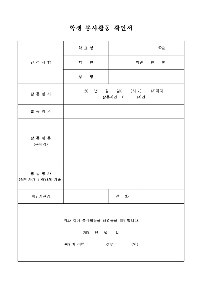9,000원/월인적사항, 할동일시, 활동장소, 활동내용, 확인기관명 등의 항목으로 구성되어 봉사활동을 하였음을 확인한다는 내용의 학생 봉사활동 확인서 양식입니다.