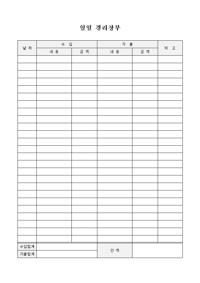 9,000원/월날짜, 수입내용 및 금액, 지출내용 및 금액 등의 항목으로 구성되어 매일 장부를 작성하여 보관하는 일일 경리장부 양식입니다.