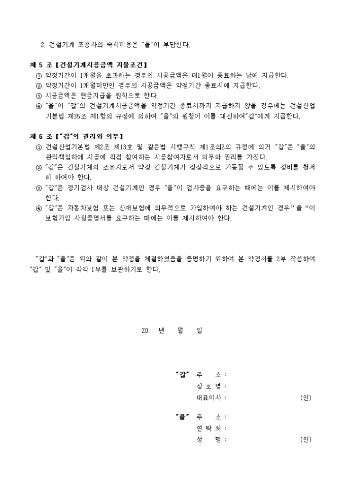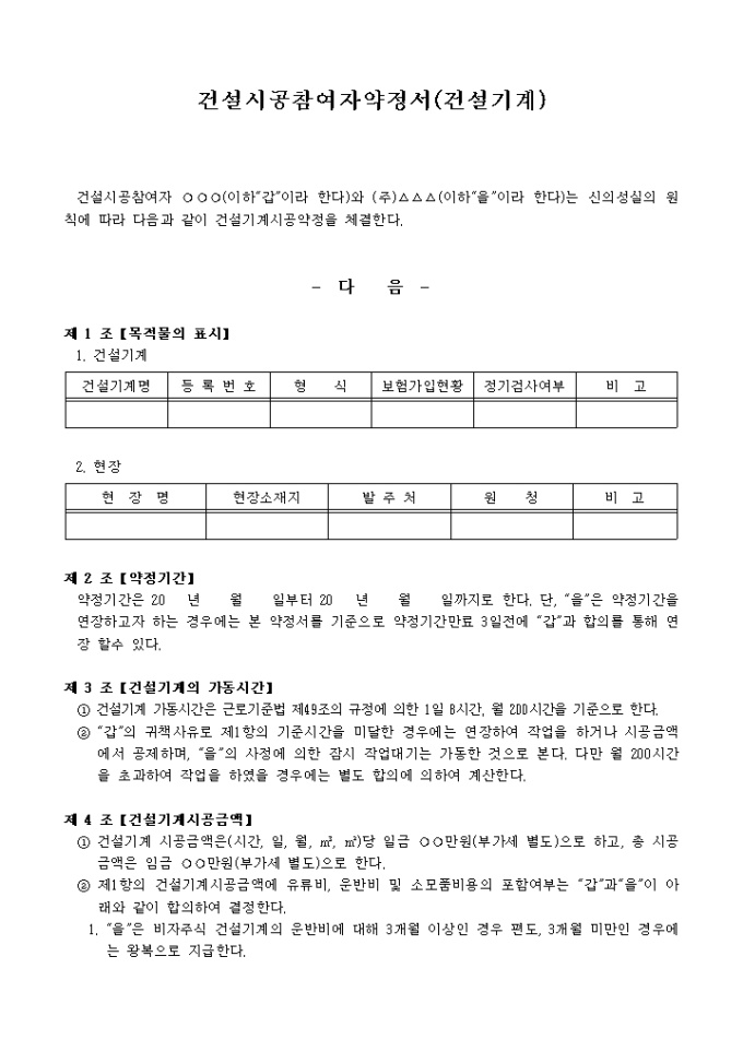 9,000원/월목적물의 표시, 약정기간, 기계의 가동시간, 시공금액, 시공금액 지불조건 등 6개조항으로 구성되어 건설시공에 참여하는 참여자에게 받는 약정서입니다.
