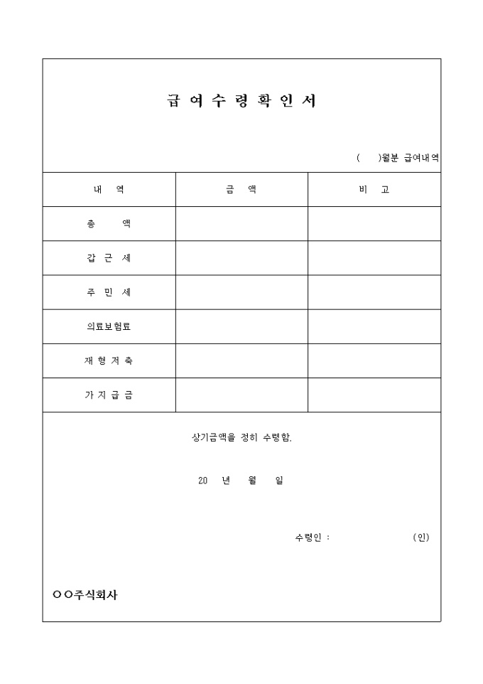 9,000원/월총액, 갑근세, 주민세, 의료보험료, 재형저축, 가지급금 등의 항목으로 구성되어 내역과 금액을 포함하여 급여를 수령했음을 확인하는 급여수령확인서 양식입니다.