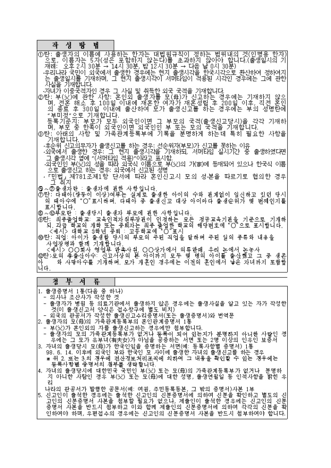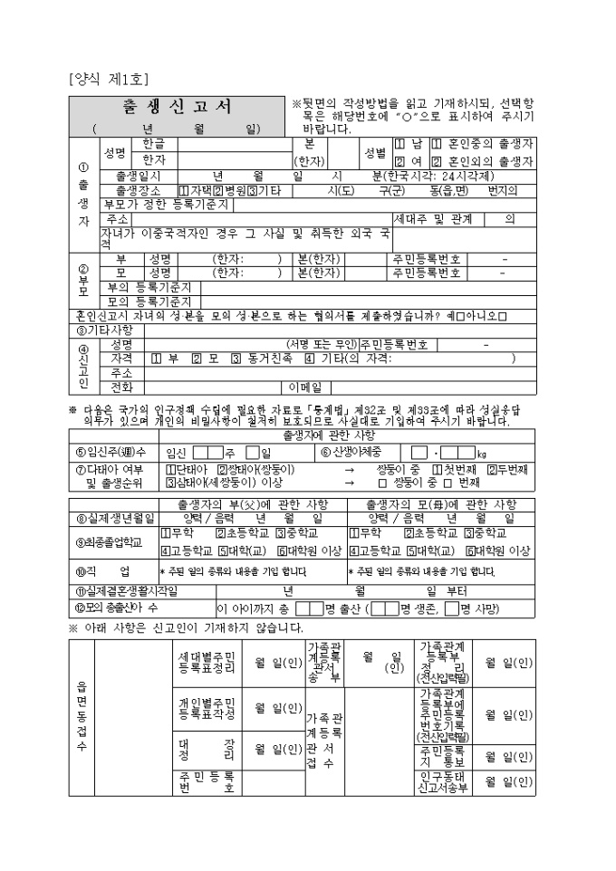 9,000원/월신생아 출생 시 호적 및 주민등록에 등록하기 위하여 시·읍·면의 장에게 신고하는[양식 제1호] 출생신고서 민원서식입니다
