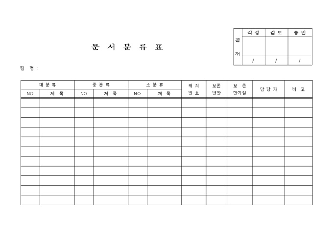 9,000원/월대분류, 중분류, 소분류별 번호, 제목과 위치번호, 보존년한, 보존만기일을 기록하는 양식입니다.