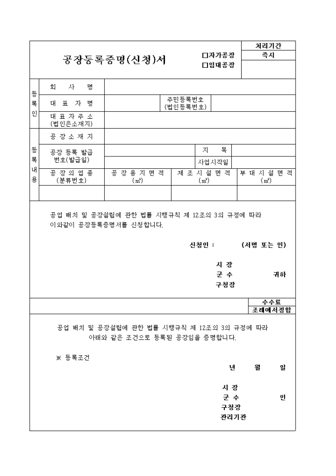 9,000원/월공장설립에 관한 법률 제12조 3의 규정에 의한 공장등록신청서입니다.