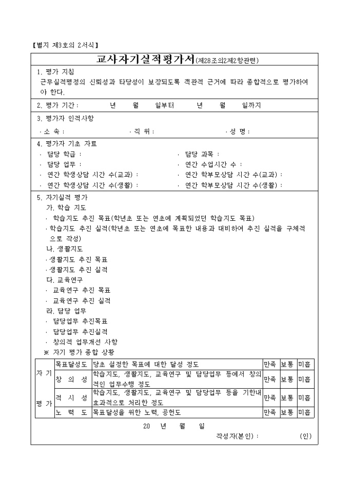 9,000원/월교육공무원승진규정 [일부개정 2007.5.25 대통령령 제20068호]에 의한 별지 제 3호의 2서식 교사자기실적평가서[제28조의2제2항관련] 양식입니다