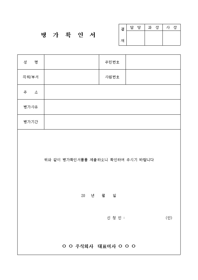9,000원/월성명, 주민번호, 직위/부서, 사원번호, 주소, 병가사유, 병가기간 등의 항목으로 구성되어 결재를 받을 때 사용하는 병가확인서 양식입니다.