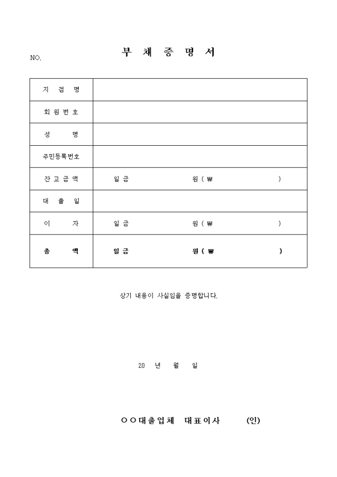 9,000원/월지점명, 회원번호, 성명, 주민번호, 잔고금액, 대출일, 이자, 총액 등의 항목으로 구성되어 남은 부채의 총액을 증명한다는 내용의 부채증명서입니다.