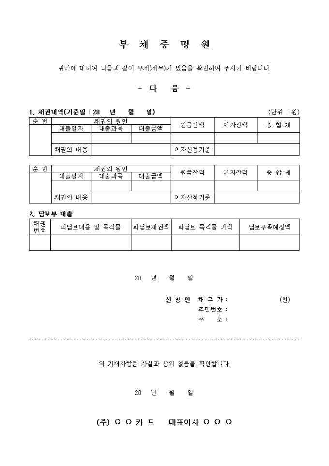 9,000원/월채권내역, 채권의 원인, 대출일자, 대출과목, 원금 및 이자잔액, 총합계 등의 항목으로 구성되어 부채가 있음을 확인하는 부채증명원입니다, 개인파산 및 개인회생시 사용 가능합니다.