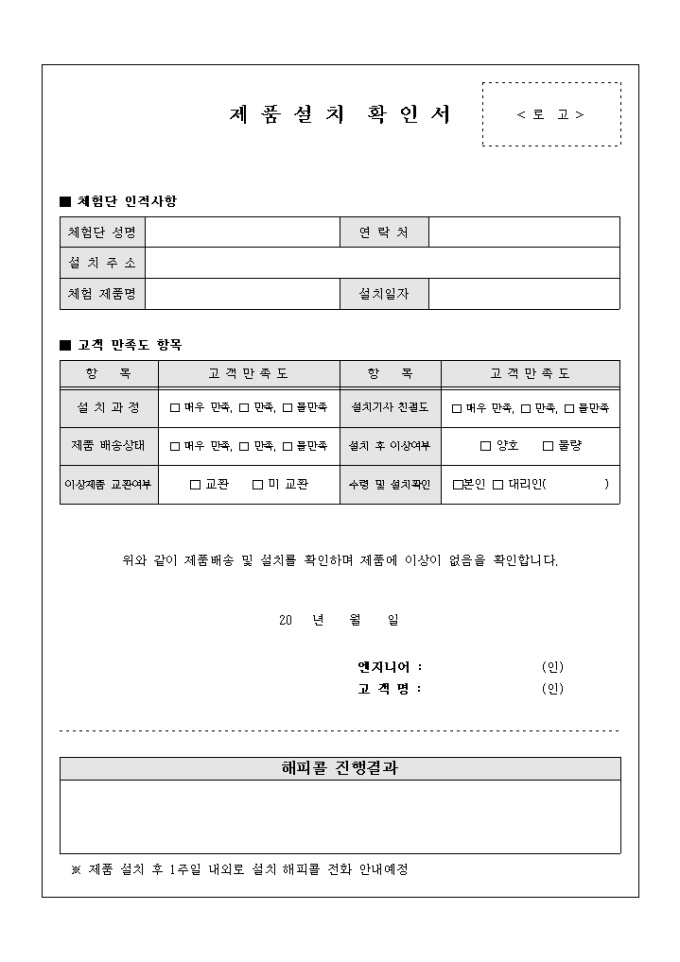 9,000원/월체험제품에 당첨인원에게 제품배송 및 설치를 확인한다는 내용의 제품 설치확인서입니다. 설치 후 해피콜 진행결과를 작성할 수 있는 란이 포함되어 있습니다.