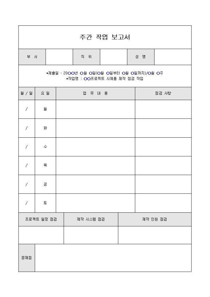 작업현황을 점검하여 보고하는 표형식의 주간작업보고서입니다.