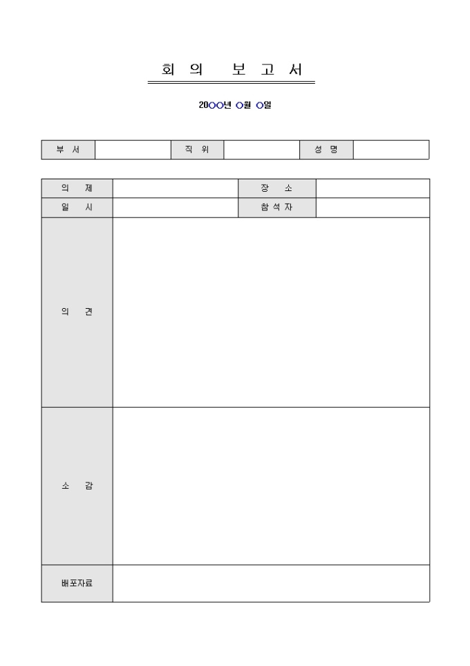 회의 진행 후 회의 내용에 대해 보고하기 위해 작성하는 회의 보고서 양식으로 규격화되고 표형식으로 구성되어 있습니다.