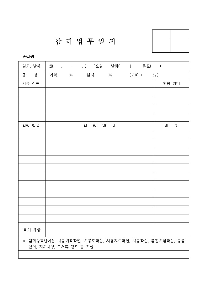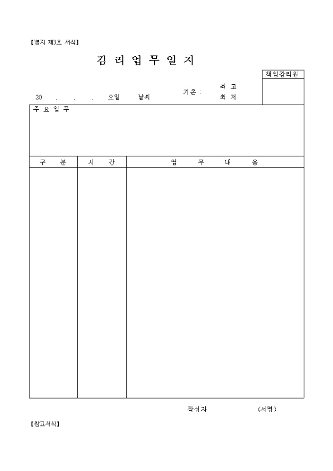 9,000원/월[별지 제1호서식] 감리업무일지 입니다. 1. 기간 또는 일자 2. 업무구분 3. 업무내용 4. 작성자 5. 확인자 의 항목으로 구성된 양식입니다.