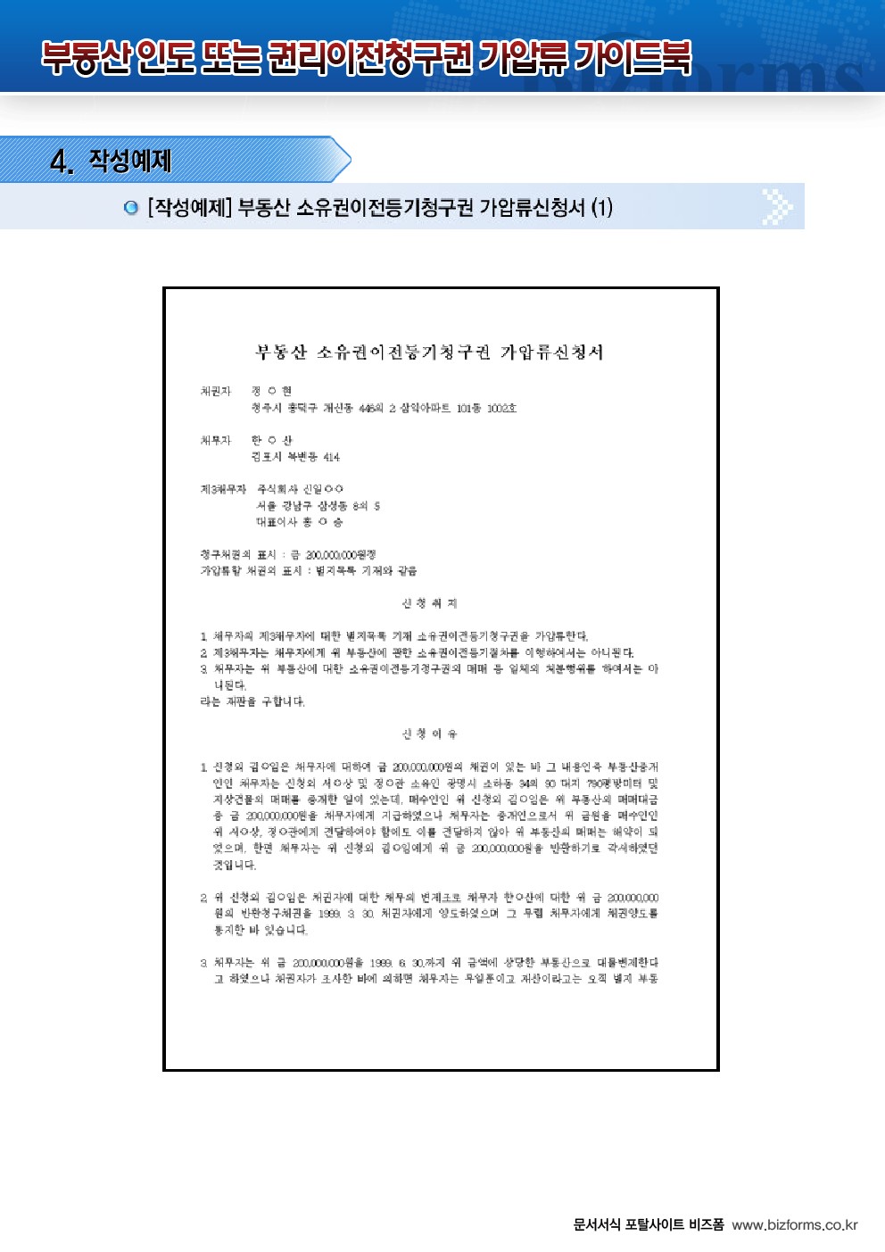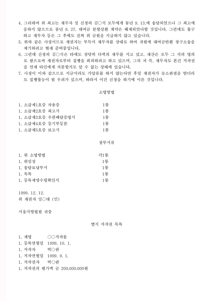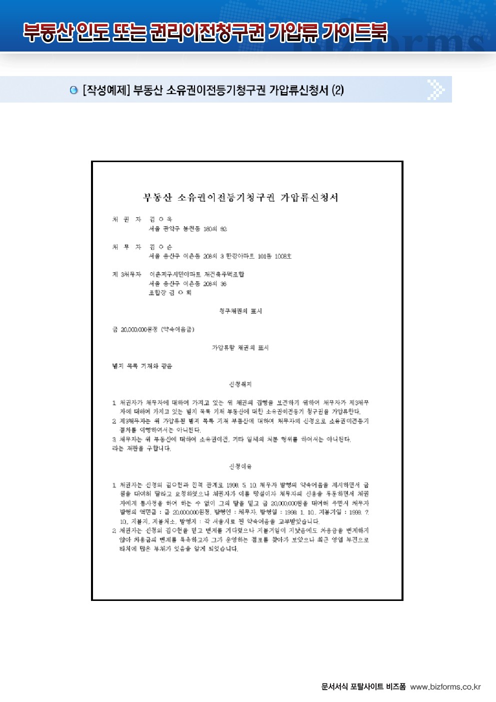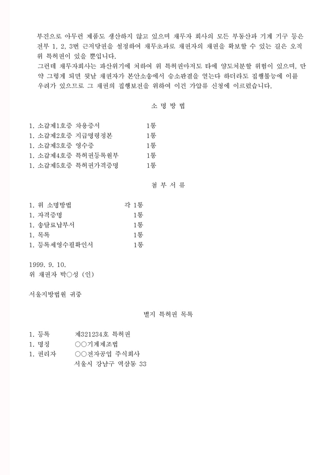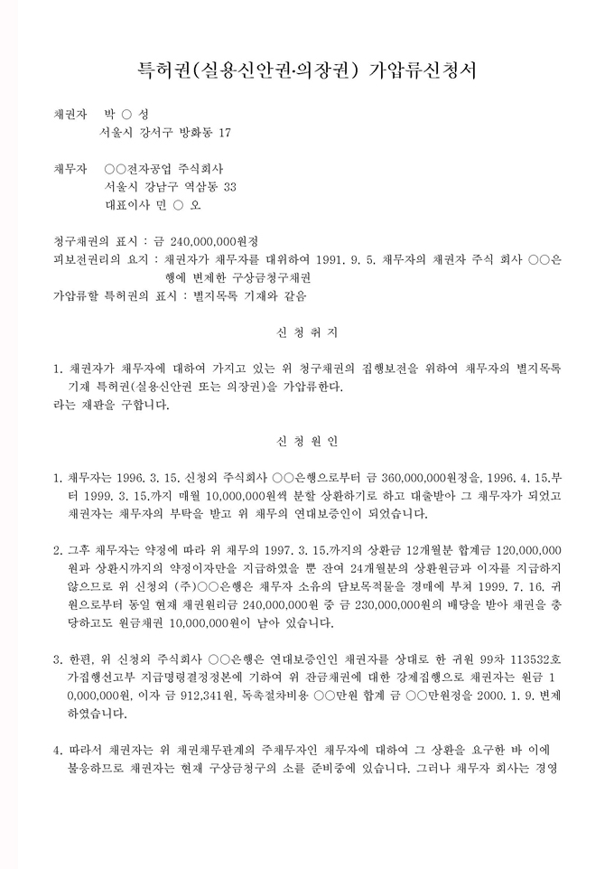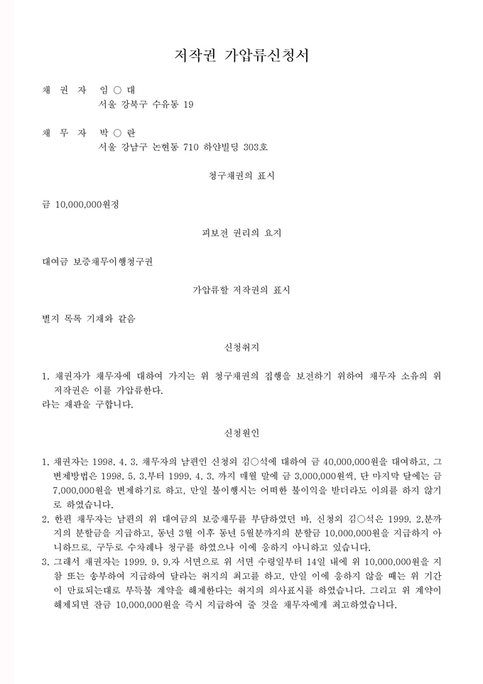 9,000원/월구성 예제 : 부동산 소유권이전등기청구권 가압류신청서 ①, 부동산소유권이전등기청구권가압류신청서 ②, 광업권가압류신청서, 저작권가압류신청서, 주권반환청구권가압류신청서, 특허권(실용신안권·의장권) 가압류신청서, 특허권가압류신청서 ※ 한글(hwp), 워드(doc), 아크로벳(pdf) 파일로 구성되어 있습니다. 부동산 인도 또는 권리이전청구권에 대한 가압류 가이드 : 부동산 인도 또는 권리이전청구권 가압류에 대한 전반적인 설명과 함께 작성법, 사례별 작성예제, 전문가 추천 예제 등이 포함되어 있습니다.