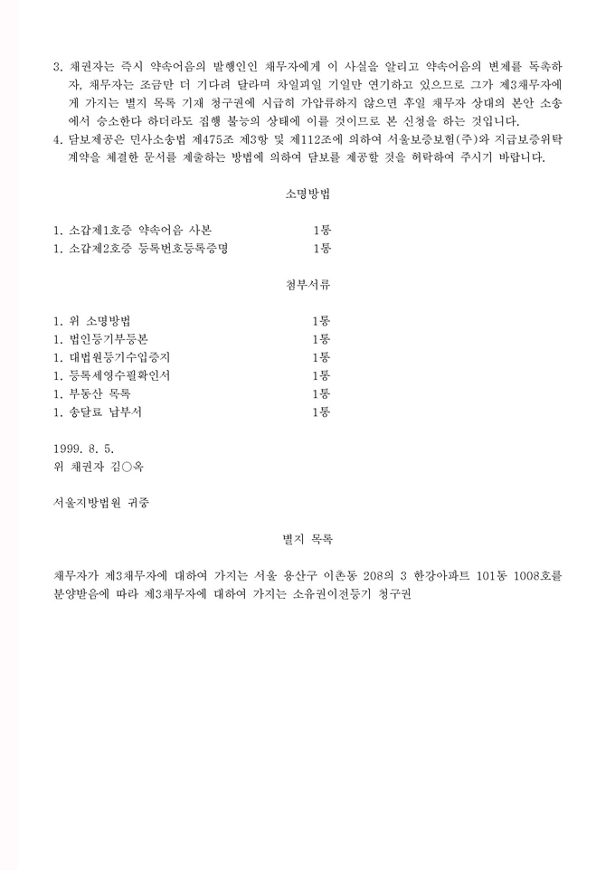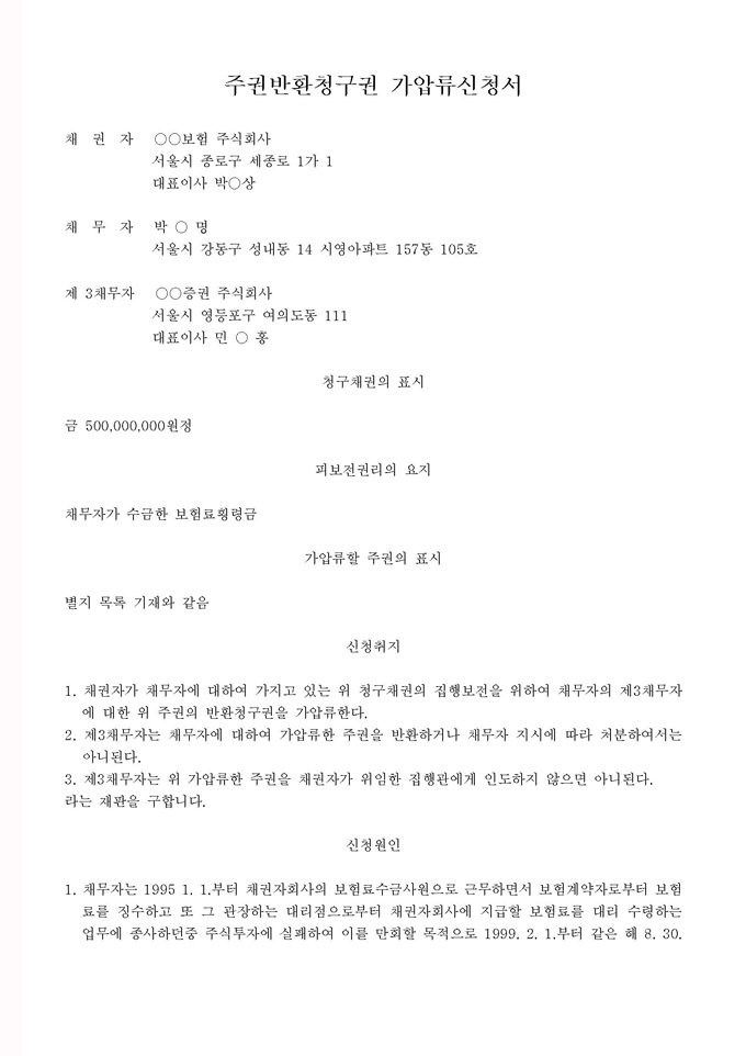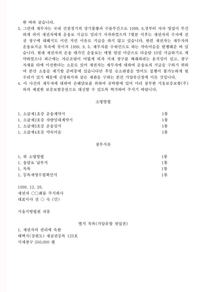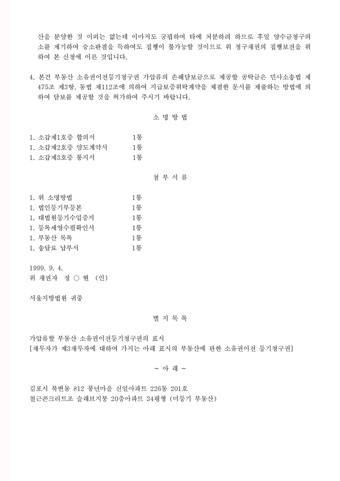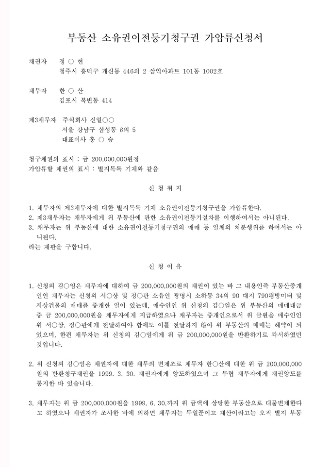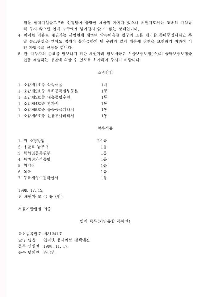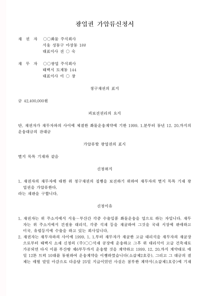 9,000원/월구성 예제 : 부동산 소유권이전등기청구권 가압류신청서 ①, 부동산소유권이전등기청구권가압류신청서 ②, 광업권가압류신청서, 저작권가압류신청서, 주권반환청구권가압류신청서, 특허권(실용신안권·의장권) 가압류신청서, 특허권가압류신청서 ※ 한글(hwp), 워드(doc), 아크로벳(pdf) 파일로 구성되어 있습니다. 부동산 인도 또는 권리이전청구권에 대한 가압류 가이드 : 부동산 인도 또는 권리이전청구권 가압류에 대한 전반적인 설명과 함께 작성법, 사례별 작성예제, 전문가 추천 예제 등이 포함되어 있습니다.