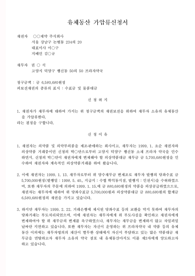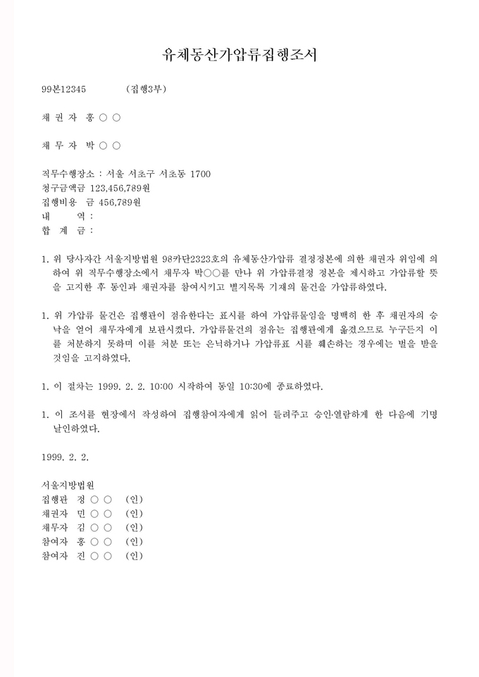 9,000원/월구성 예제 : 유체동산 가압류신청서 ①, 유체동산 가압류신청서 ②, 유체동산 가압류집행조서 ※ 한글(hwp), 워드(doc), 아크로벳(pdf) 파일로 구성되어 있습니다. 유체동산의 가압류 가이드 : 유체동산 가압류에 대한 전반적인 설명과 함께 작성법, 사례별 작성예제, 전문가 추천 예제 등이 포함되어 있습니다.