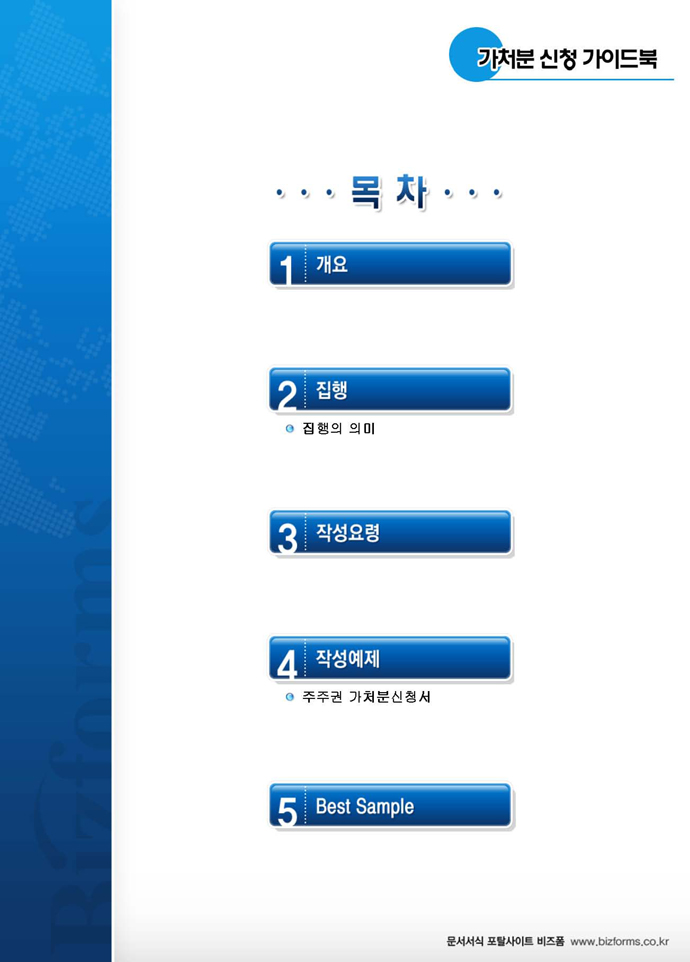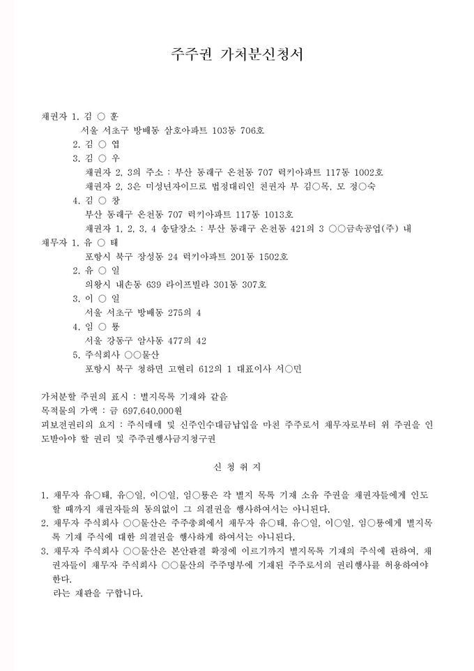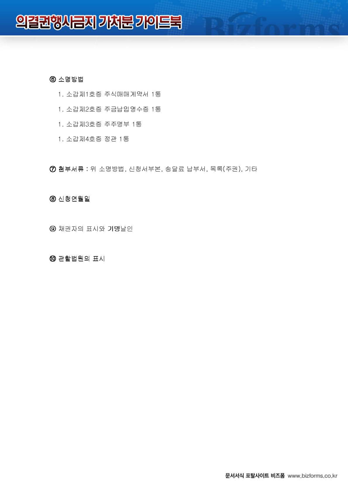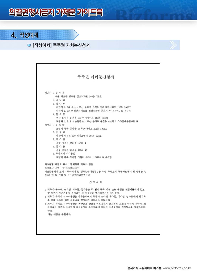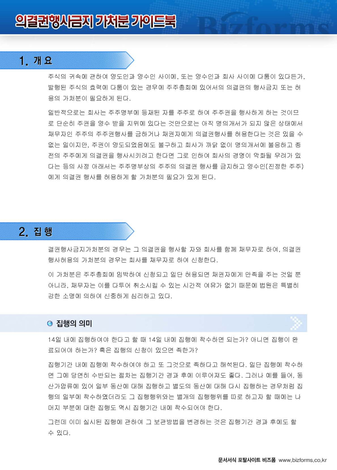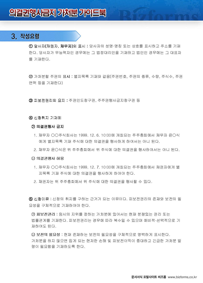 9,000원/월구성 예제 : 주주권 가처분신청서 ※ 한글(hwp), 워드(doc), 아크로벳(pdf) 파일로 구성되어 있습니다. 의결권 행사금지 가처분 가이드 : 의결권 행사금지 가처분에 대한 전반적인 설명과 함께 작성법, 사례별 작성예제, 전문가 추천 예제 등이 포함되어 있습니다.