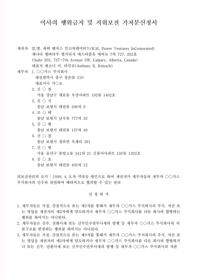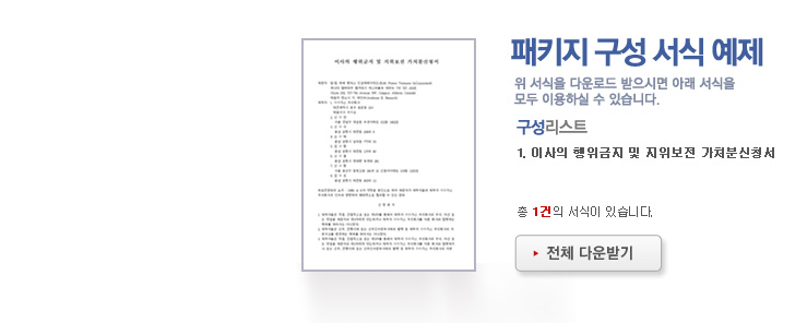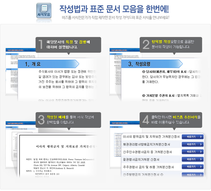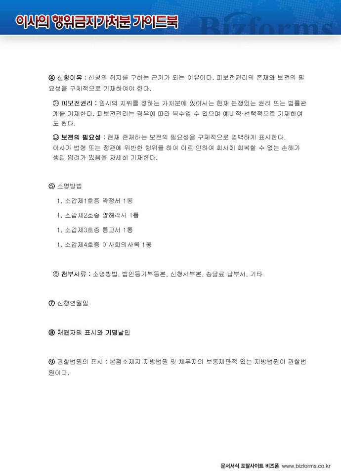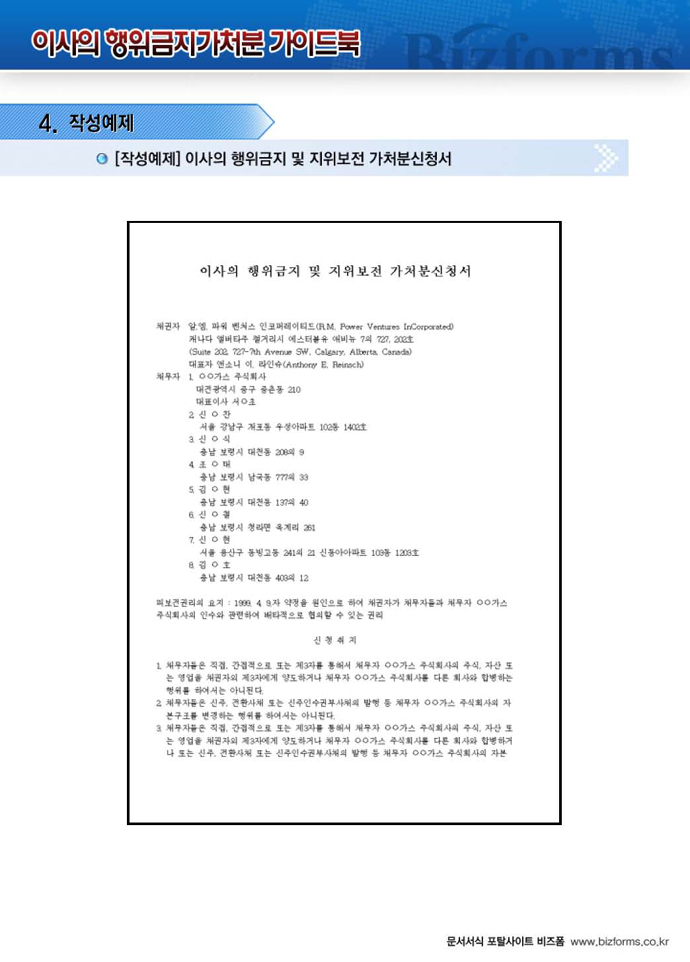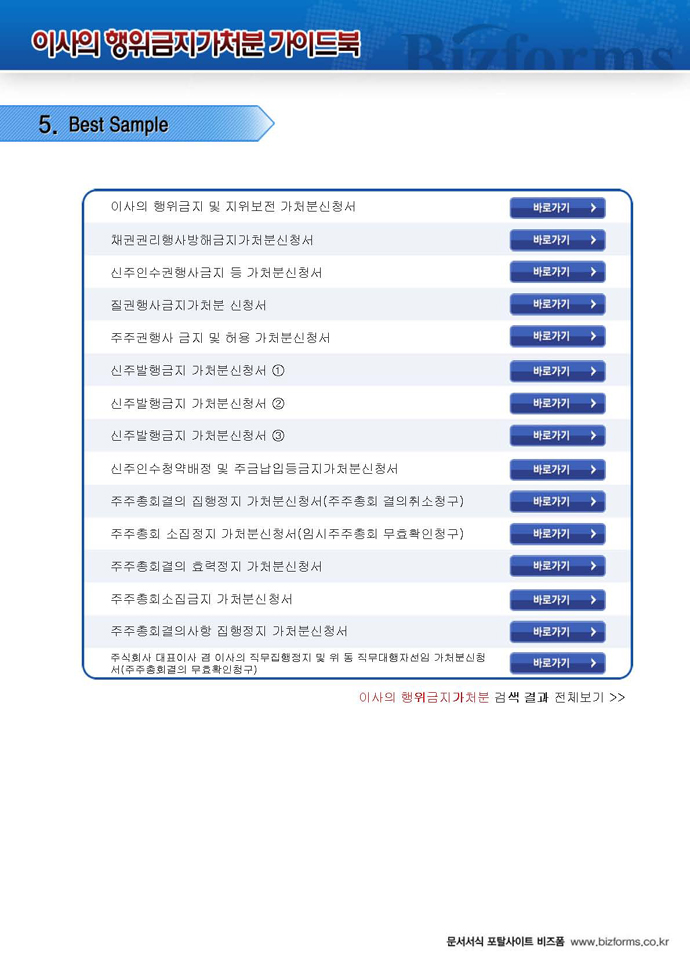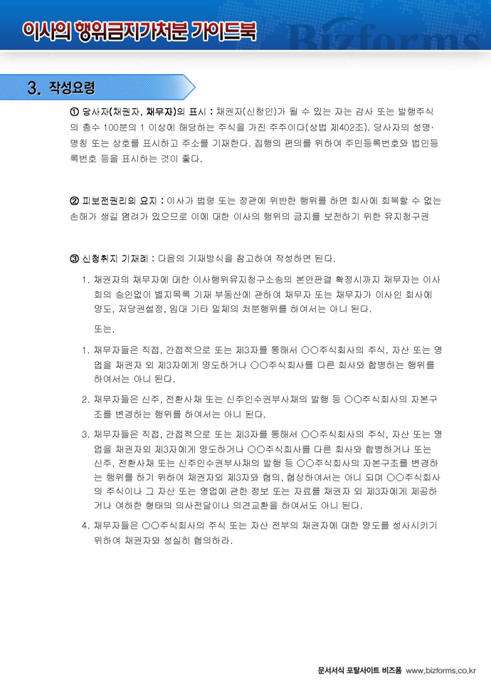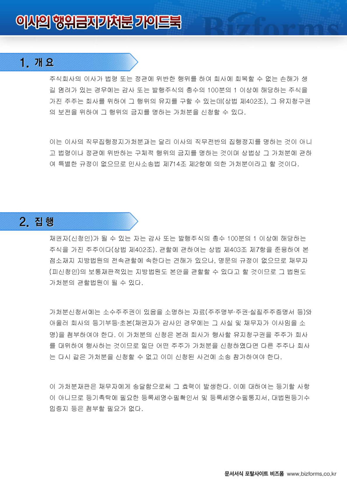 9,000원/월구성 예제 : 이사의 행위금지 및 지위보전 가처분신청서 ※ 한글(hwp), 워드(doc), 아크로벳(pdf) 파일로 구성되어 있습니다. 이사의 행위금지 가처분 가이드 : 이사의 행위금지 가처분에 대한 전반적인 설명과 함께 작성법, 사례별 작성예제, 전문가 추천 예제 등이 포함되어 있습니다.