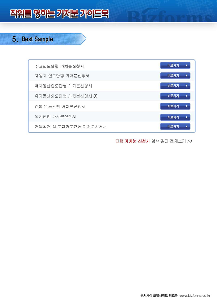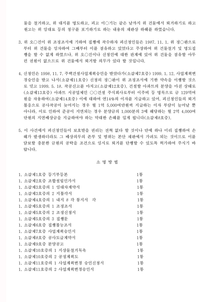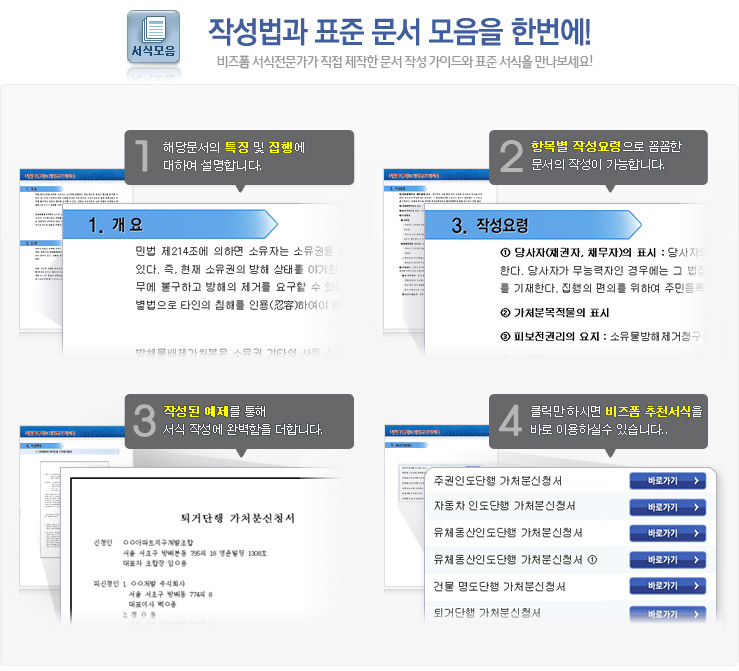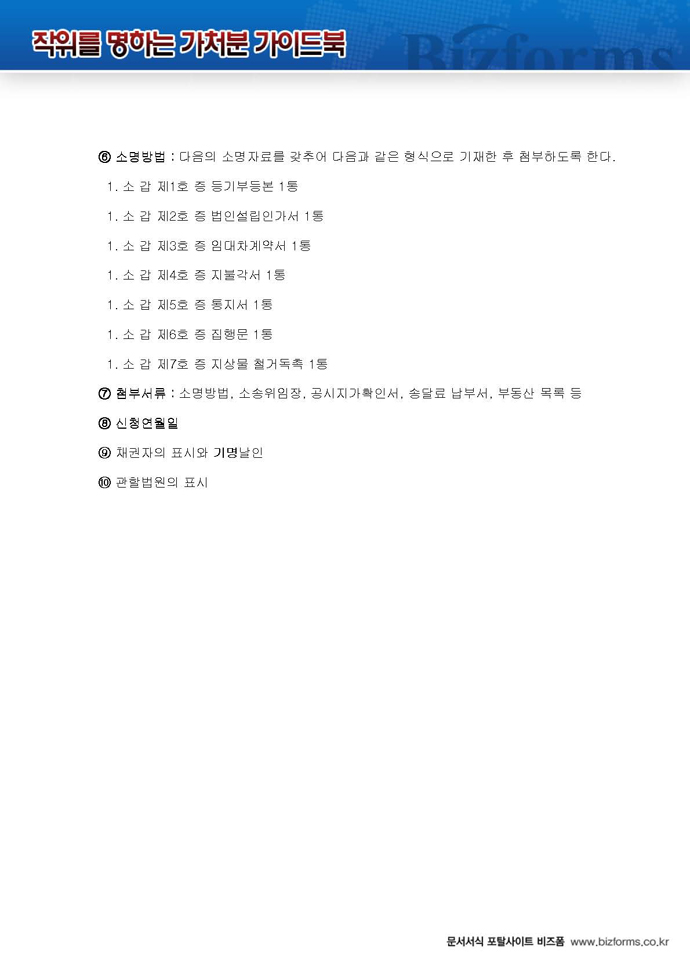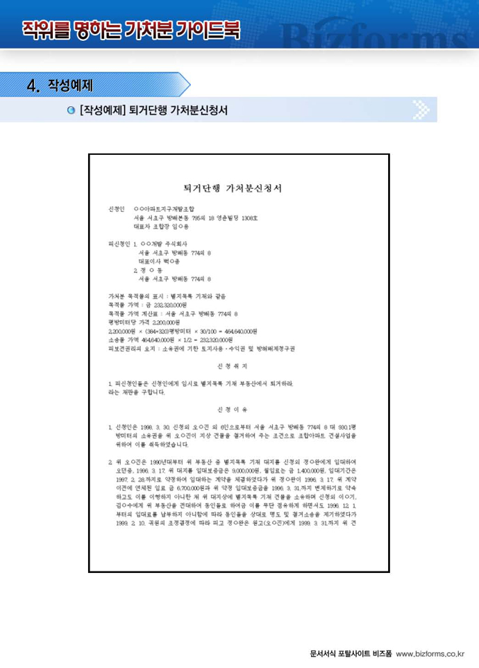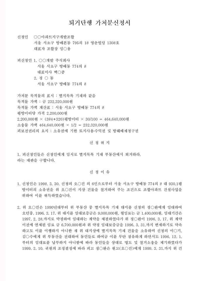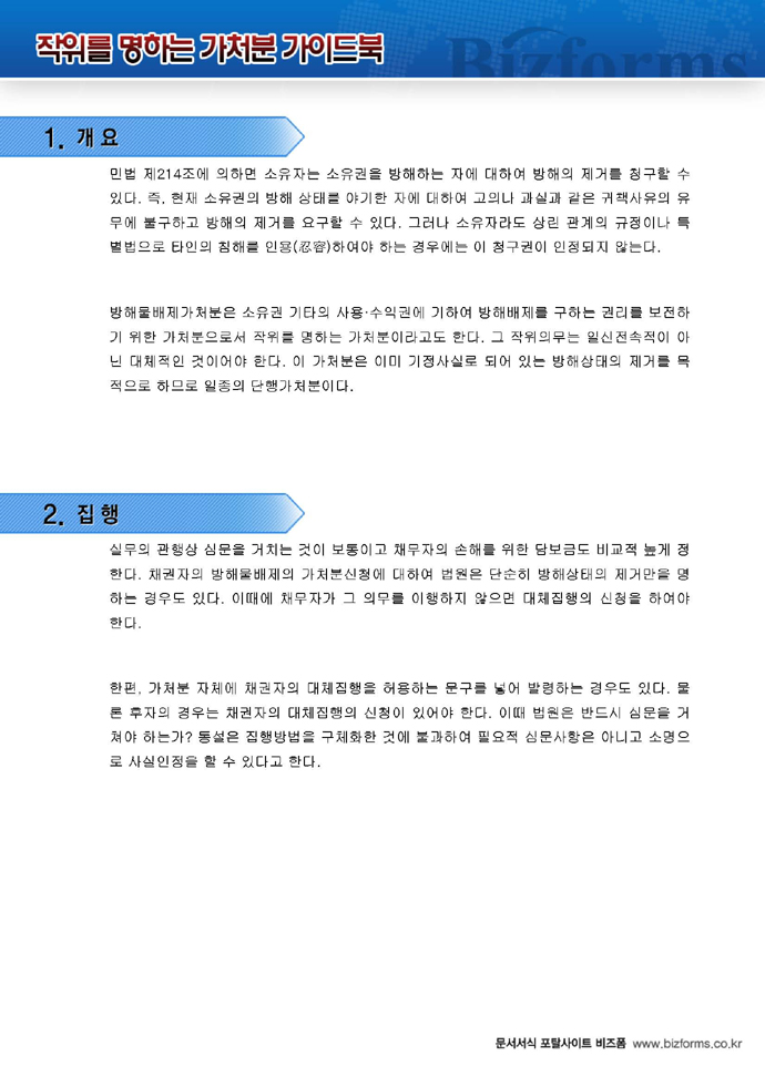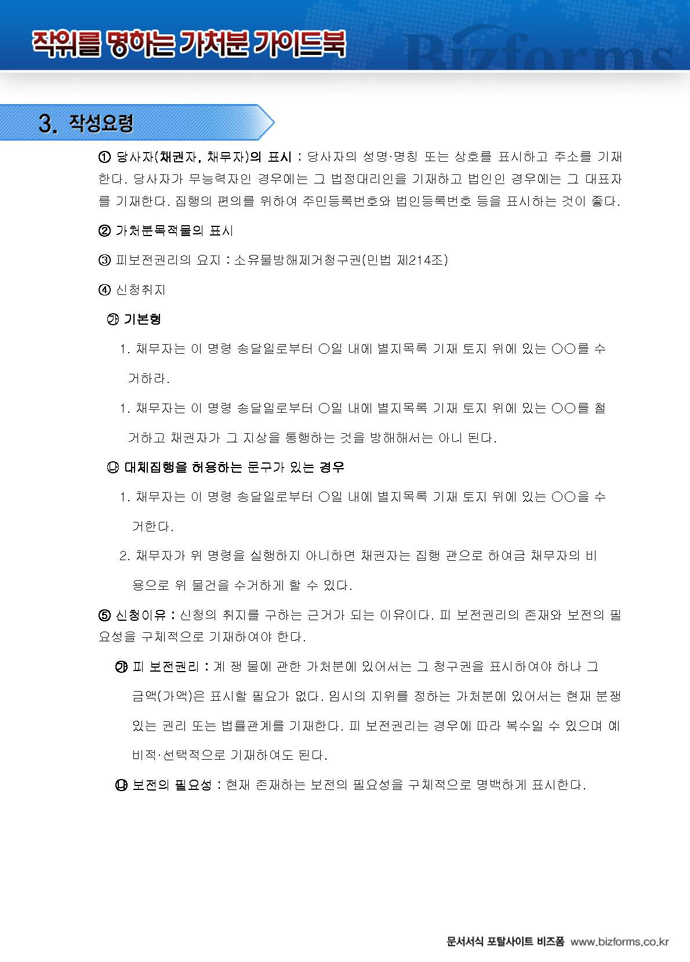 9,000원/월구성 예제 : 퇴거단행 가처분신청서 ※ 한글(hwp), 워드(doc), 아크로벳(pdf) 파일로 구성되어 있습니다. 작위를 명하는 가처분 가이드 : 작위를 명하는 가처분에 대한 전반적인 설명과 함께 작성법, 사례별 작성예제, 전문가 추천 예제 등이 포함되어 있습니다.