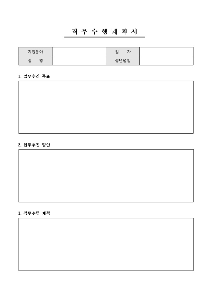 직무수행에 대한 업무추진목표, 업무추진방안, 직무수행계획, 직무추진 일정, 결언의 항목으로 구성된 직무수행계획서 양식입니다.