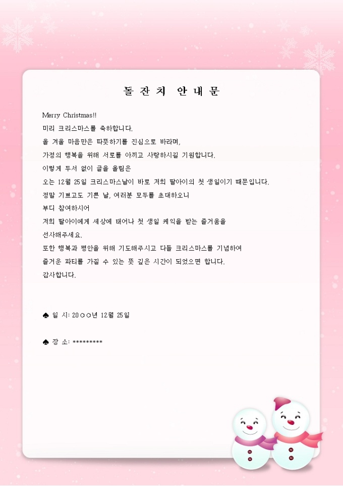 9,000원/월돌잔치 안내문으로 크리스마스 시즌에 생일을 맞이한 경우에 사용가능합니다.
