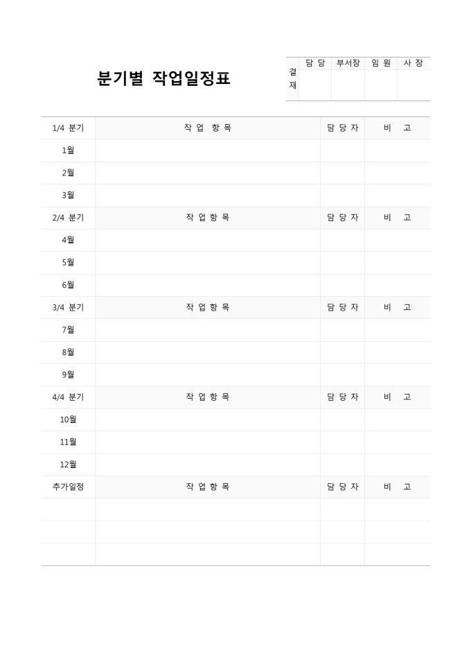 9,000원/월분기별로 작업일정을 기록/ 관리할 수 있는 분기별 작업일정표입니다. 작업항목, 담당자, 비고 등의 항목으로 구성되어있습니다.