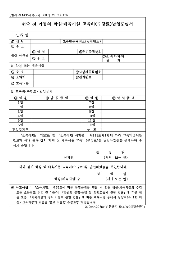 9,000원/월[2008년 연말정산]취학 전 아동의 학원·체육시설 교육비(수강료) 납입증명서입니다.