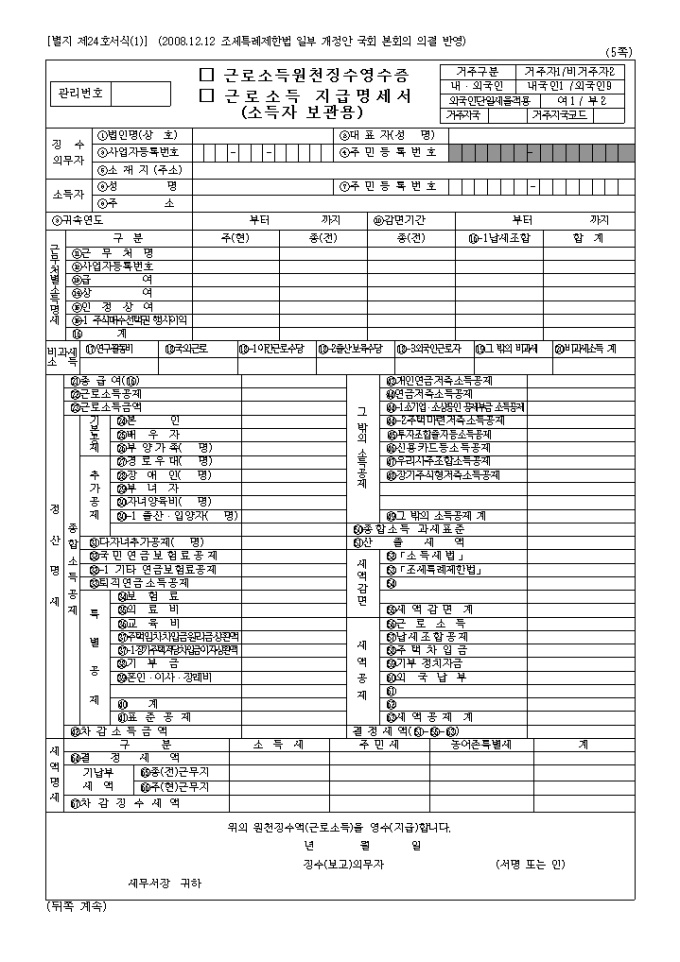 9,000원/월근로소득원천징수영수증,근로소득지급명세서(개정2008.12.12) 서식입니다.