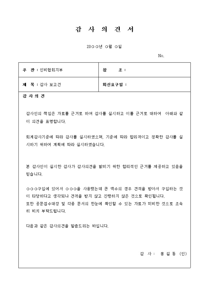 9,000원/월감사에 대한 의견의 예제가 포함되어 있는 서식입니다.