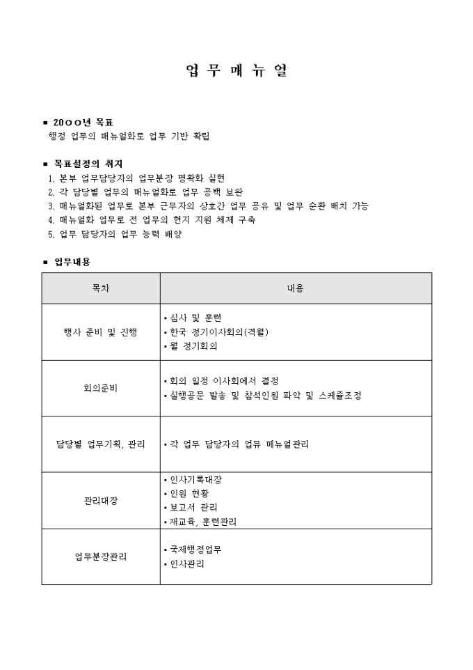 9,000원/월행정업무에 대한 매뉴얼로 목표와 목표설정의 취지, 업무내용의 항목으로 구성되어 있습니다.