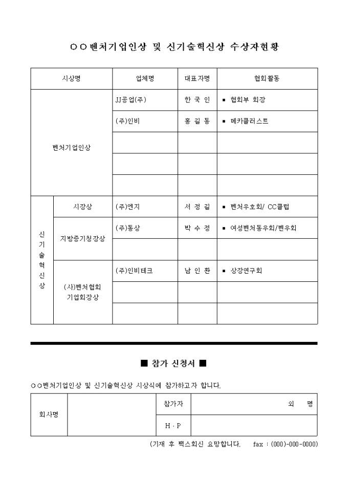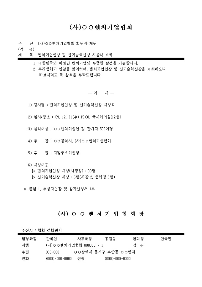 9,000원/월기업에서 시상식,세미나를 개최한다는 공문예제입니다. 수상자현황과 참가신청서가 별도로 첨부되어 있습니다.