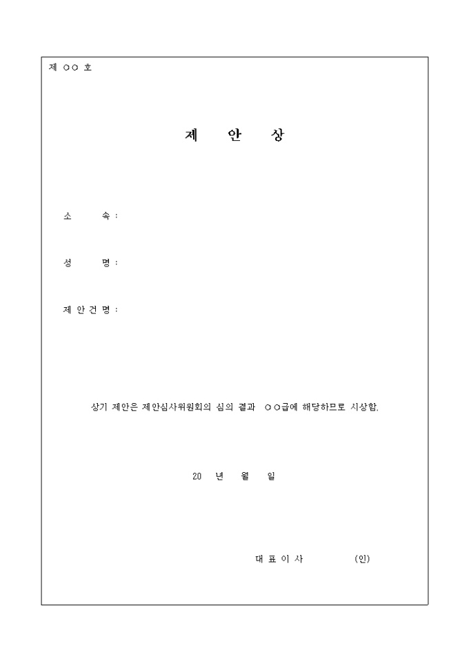 9,000원/월제안의 결과에 따라 포상하는 제안상장 양식입니다.